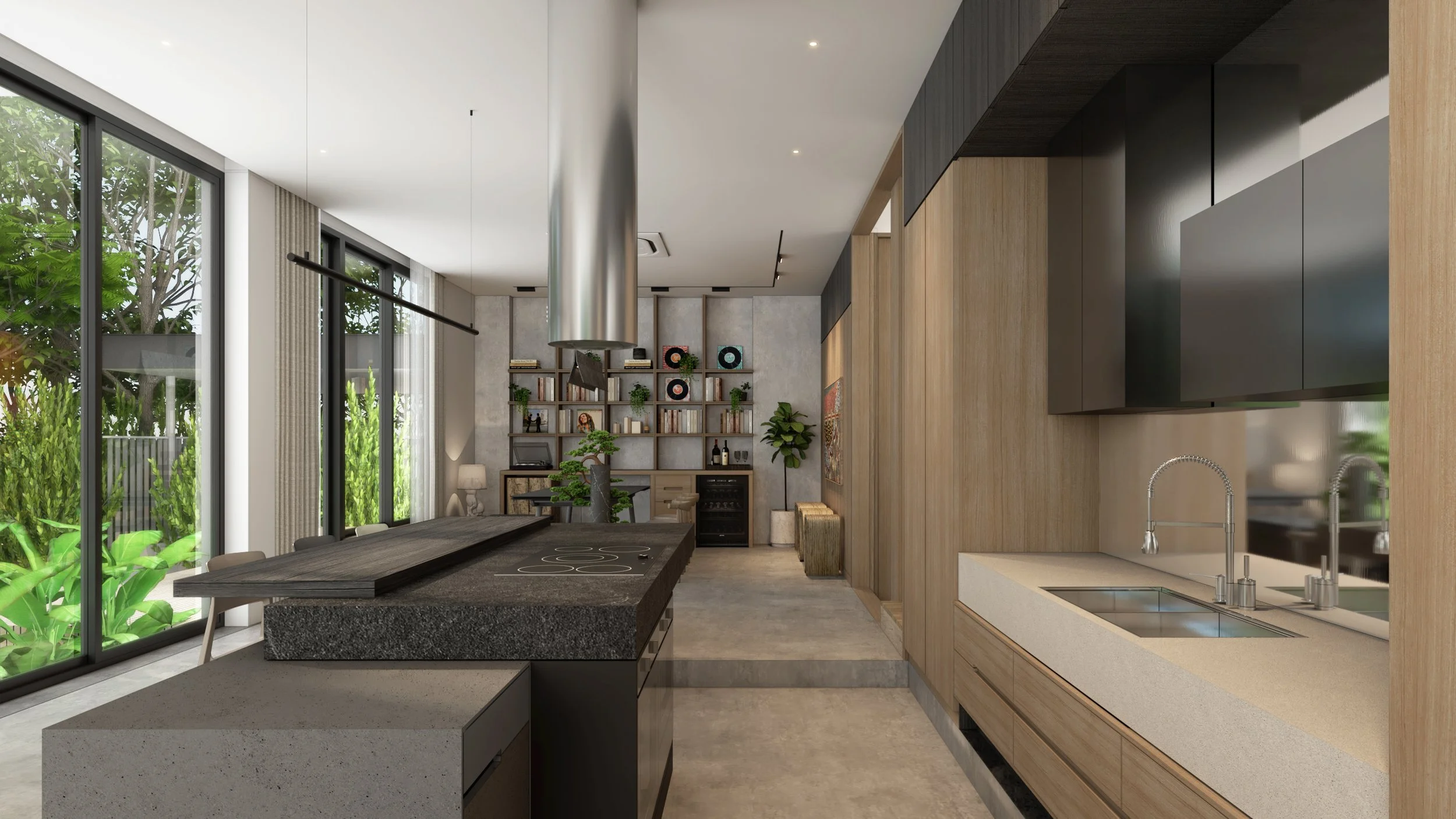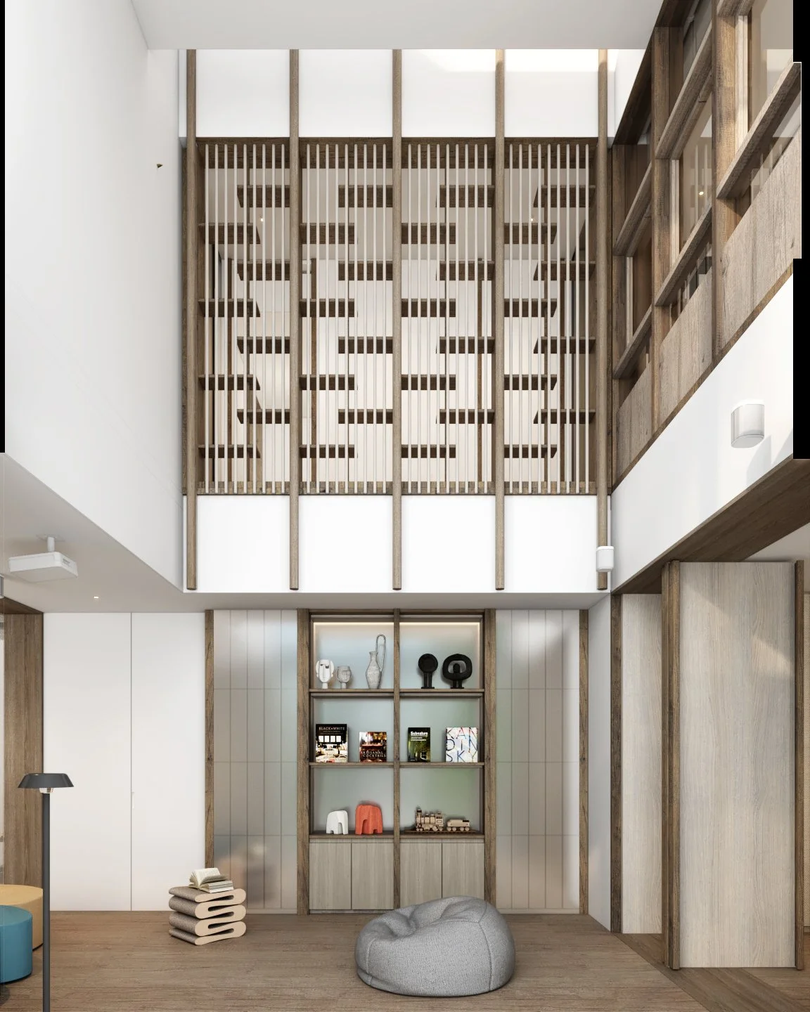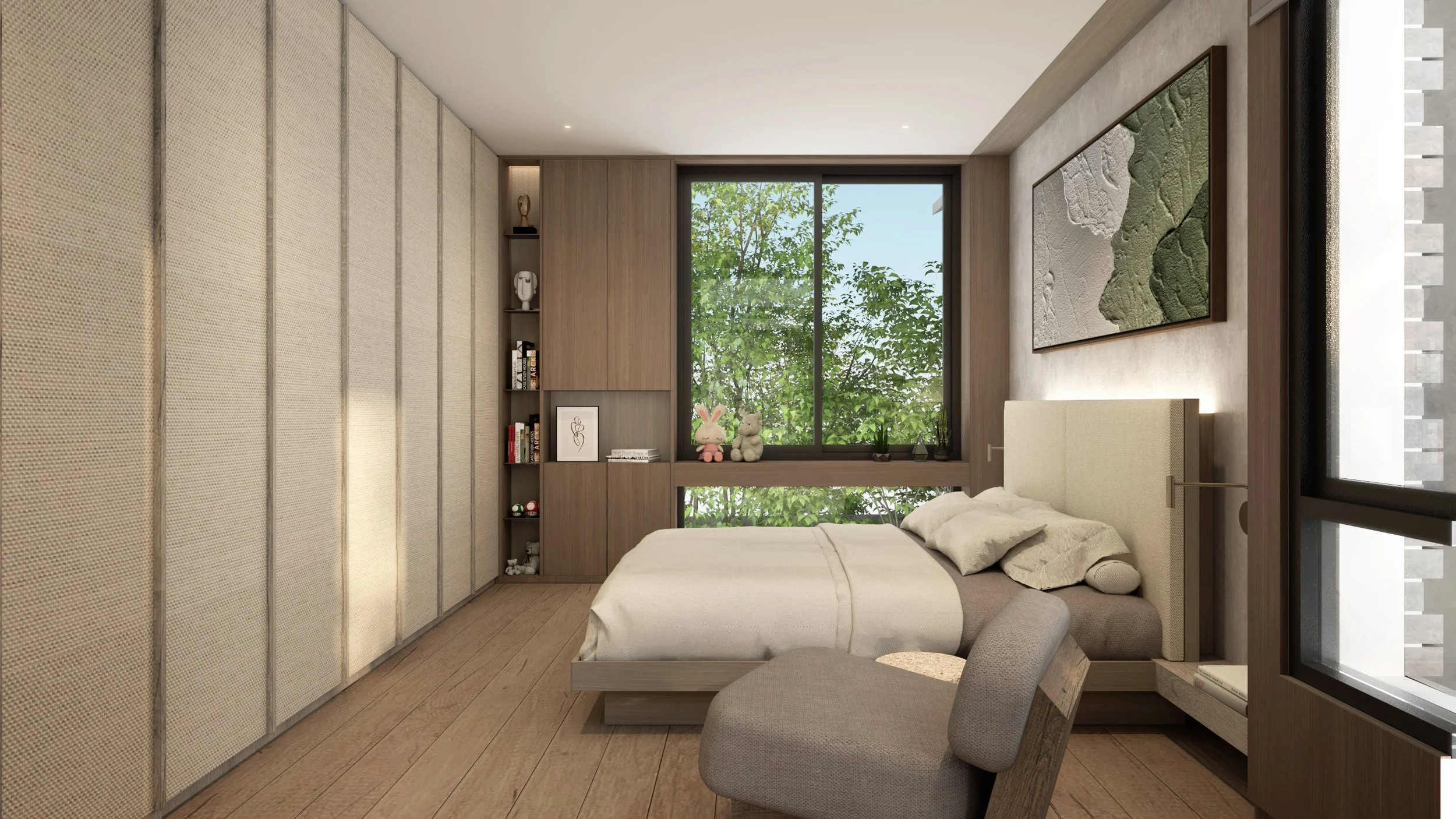 Second Floor: The master bedroom features a double-height volume and expansive openings, immersing occupants in the garden’s upper layers. A netted terrace juts outward, suspended over the garden for a fully immersive, tree-top experience.