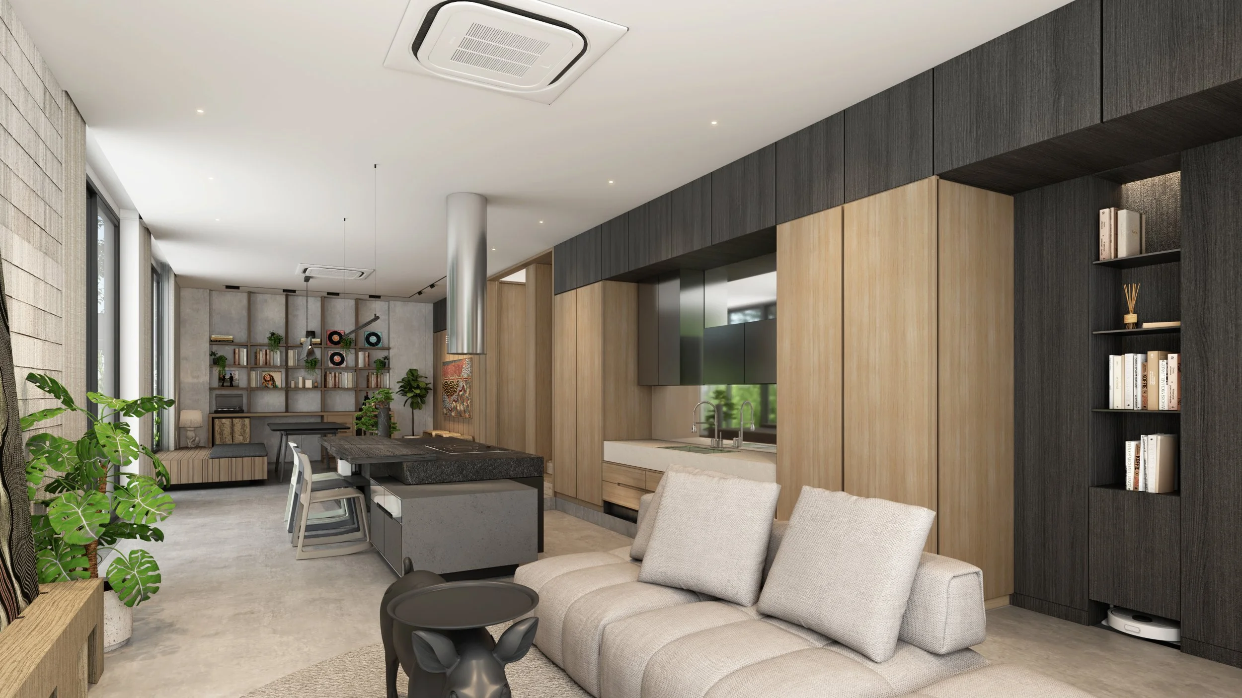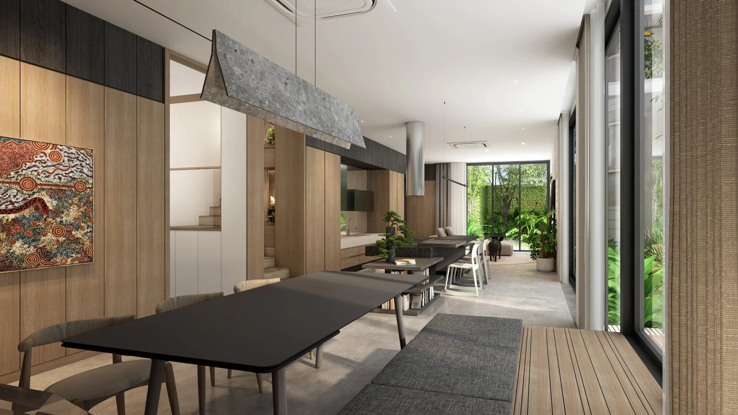 Nestled next to the owner's family home and a lush garden, this project reimagines urban living as a forest retreat within Bangkok's concrete landscape. The site was originally occupied by a typical shophouse, which was demolished to make way for a new structure that shifts its focus away from the narrow front lane and toward the adjacent owner’s family garden. The design seeks not only to maximize visual connection with this green space but also to embody its spatial qualities.