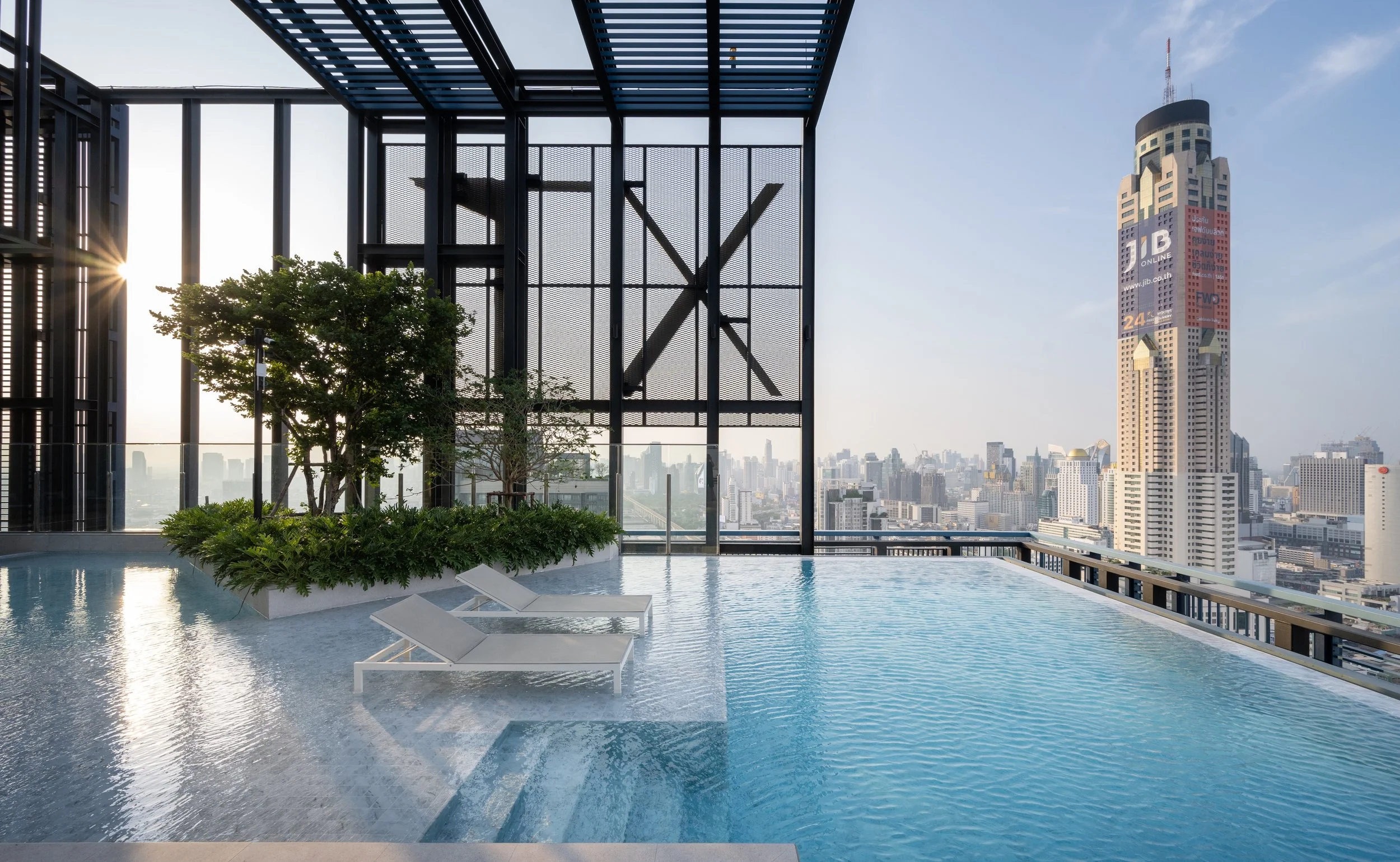 Extensive use of glass walls and windows invites natural light into the interior, while aluminum screening elements provide a second skin to mitigate solar heat gain. Interstitial negative spaces between the forms are creatively utilized as shaded courtyards and garden balconies, enhancing the building’s livability and connection to nature.